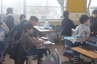 先生は端末を見ながら、子どもたちの教え合い活動を見届けています。