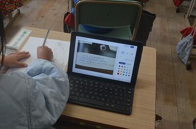 図鑑を写真に撮り、タブレット端末上で、教科書と同じように、「しごと」と「つくり」を色分けして線を引いていきます。教科書とは文章の表し方も違うので難しそうにしていました。