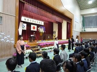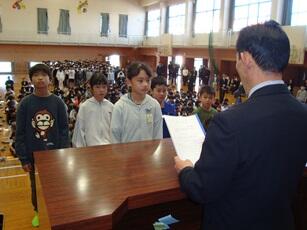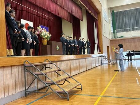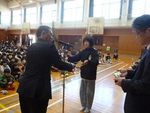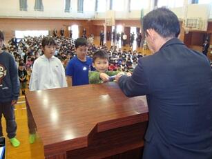 1年生から5年生のそれぞれの代表がステージに上がり、校長先生から通知表(あゆみ)の修了証を受け取ります。代表ではない児童もその場に立ち、代表児童と一緒に礼をします。
