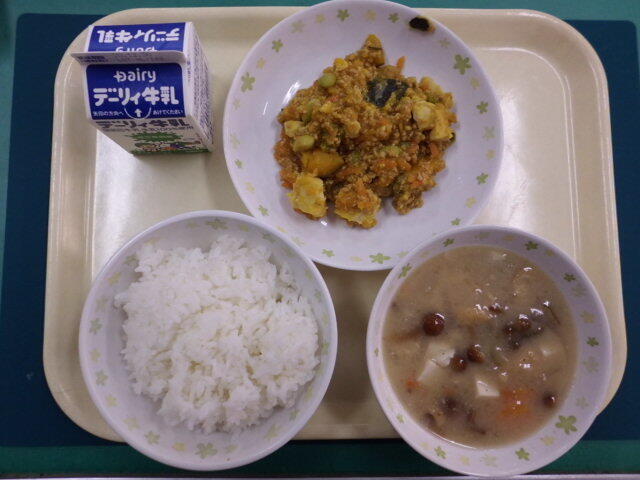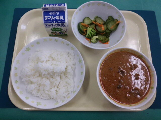 白いご飯 牛乳 ポークカレー 青豆とチーズのサラダ