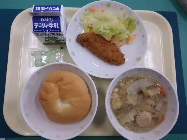 米粉パン 牛乳 白身魚フライ ブロッコリーサラダ ミネストローネ