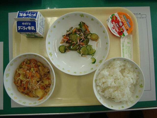 白ごはん 牛乳 新じゃがいものそぼろ煮 茎わかめのサラダ アセロラゼリー