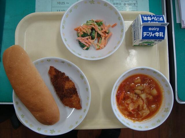米粉パン 牛乳 白身魚フライ ブロッコリーサラダ ミネストローネ