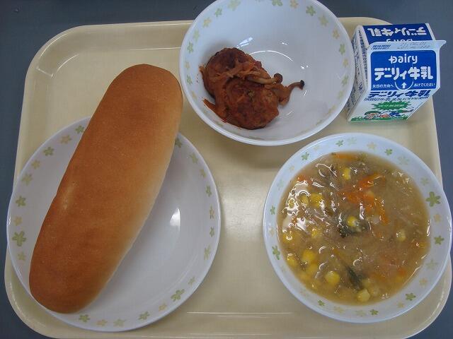 コッペパン チョコレートネオソフト 牛乳 オムレツのトマトソースがけ 野菜とマロニーのスープ