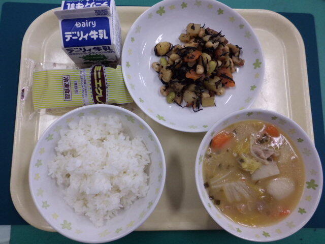 白ご飯 牛乳、野菜のごまみそ煮 ひじきの炒め煮