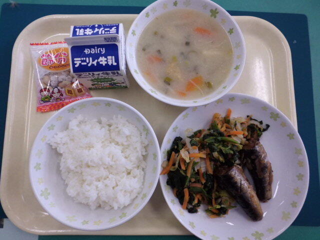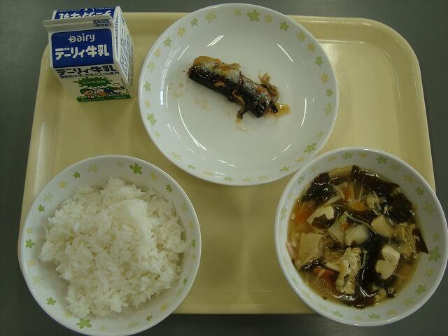 白いご飯 牛乳 いわしかぼすレモン煮 ごぼうの金平 若竹汁