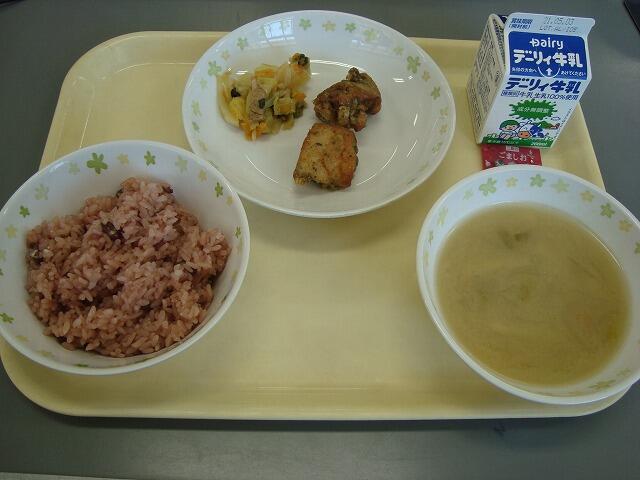 赤飯 ごま塩 牛乳 とり肉の磯部からあげ 野菜ソテー 春野菜のみそ汁