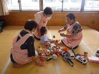 来年の4月には小学生になる友だちに「おもちゃ」の遊び方を分かりやすく説明する1年生。いつもよりもお兄さん、お姉さんになり、笑顔で交流していました。