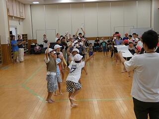 第1部は「火をむかえる儀式」、第3部は「火を送る儀式」で、厳粛な雰囲気で行われます。第2部は「出し物」などがあり、とても楽しい時間です。各クラスの紹介、祝吉小クイズなどで盛り上がりました。