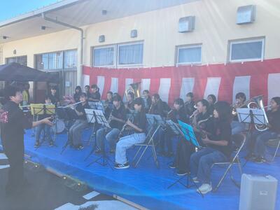 特設ステージでは、こども発表、祝吉こども絵画コンクール表彰式、地域の皆様による演芸発表がありました。祝吉小の吹奏楽部は1番目に出演し、「マツケンサンバⅡ」で盛り上げてくれました。