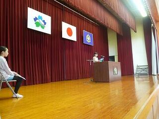 まず、祝吉小学校の研究についての発表です。研究主任の先生が、研究テーマや1学期に行った研究授業について報告しました。