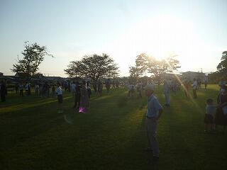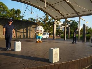 この日は、早水公園多目的広場と川東小学校校庭に、多くの皆さんが集まりました。ラジオ体操カードを持った小学生、中学生もいっぱい参加していました。そして、早水公園にはスペシャルゲストとして、「ぼんちくん」も登場し、子どもたちは大喜びでした。