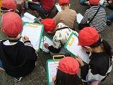 子どもたちは、北コースと東コースに分かれて、歩きながら建物や土地の様子について気付いたことをメモに書き込んでいきました。普段、何気なく通っている場所も、改めて見てみるといろいろな発見があったようです。