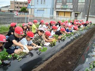 2年生は一人ずつさつまいもの苗を選び、畑に植えていきました。「げんきにそだってね。」と願いながら植えていました。これからは水やりをしたり、草とりをしたりしながら、さつまいもが育つのを見守っていきます。秋の収穫が楽しみですね。