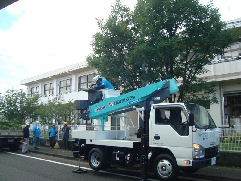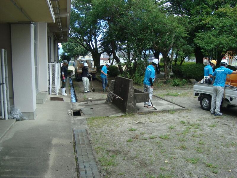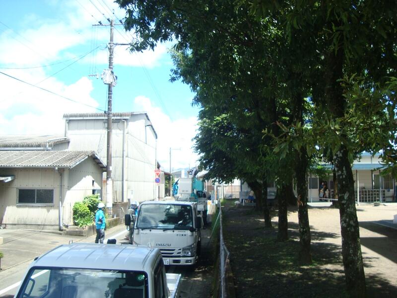 今回、祝吉小学校では、「側溝に溜まった泥の除去」と「高い樹木の枝切り」の作業をしてもらいました。夏の日差