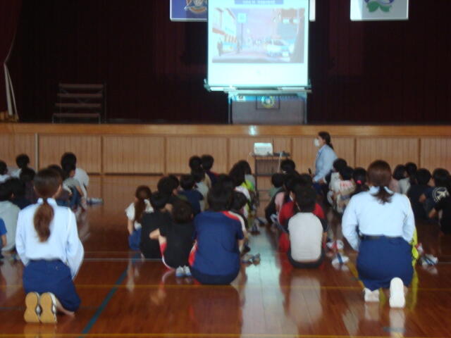 6月4・5日、学年ごとに体育館にて「交通安全教室」を実施しました。都城地区交通安全協会の指導員を講師として招き、3~6年生は主に「自転車点検の仕方」「自転車の操作方法・乗り方」、1・2年生は主に「道路横断の模擬体験」「道路の正しい使い方」を学習しました。また、全学年、「道路標識・交通安全クイズ」を学習して、交通安全に対する意識を高めたり、安全な自転車の乗り方を身に付けたりすることができました。