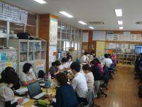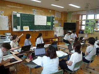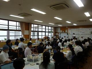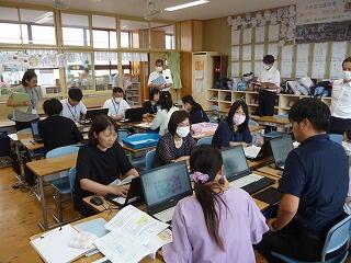 写真は、7月27日(水)の午前中に行われた職員室での主題研究の様子です。