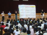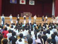 終業式の後は生徒指導部の先生方からのお話でした。校長先生と同じく「命」を守ること、そのために「車」「人」「水」「火」「金」に気を付けることというお話でした。途中で劇があって、楽しく分かりやすいお話でした。