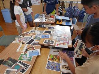 子どもたち:「色合いが似ているね」「日本的な絵だね」「立体的な作品だ」「白と黒で描かれているよ」「とってもカラフル」「人の絵」「自然の景色」・・・