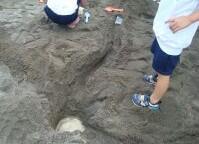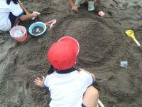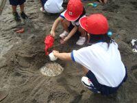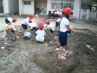 今週は、校内の砂場で1年生が生活科の「夏で遊ぼう」という単元で、水や砂を使って遊ぶ学習を行っています。砂で山を作ったり、水の流れる水路を作ったりして、思い思いに学習に取り組んでいました。