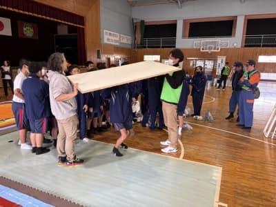 子どもたち全員が、20kgのコンパネを手で支えます。