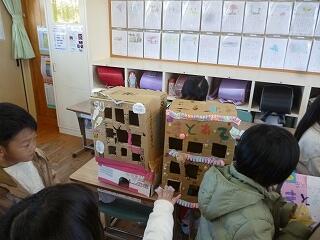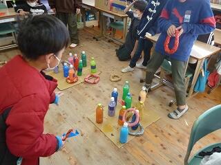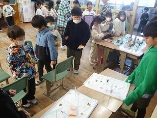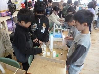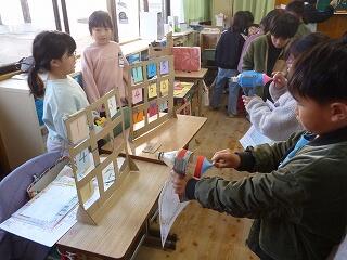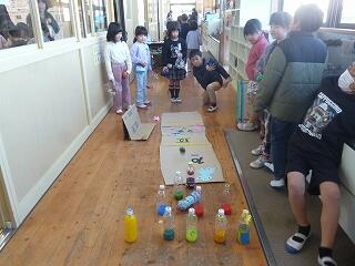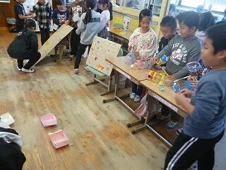 2年生が作ったおもちゃ(ゲーム)は、「魚つり」「ボーリング」「ストローめいろ」「しゃてき」「的当てゲーム」など。他にも「UFOキャッチャー」「空気でっぽう」など、かなり時間をかけたと思われるおもちゃがありました。本を見たり、先生から教えてもらったりして作ったそうです。