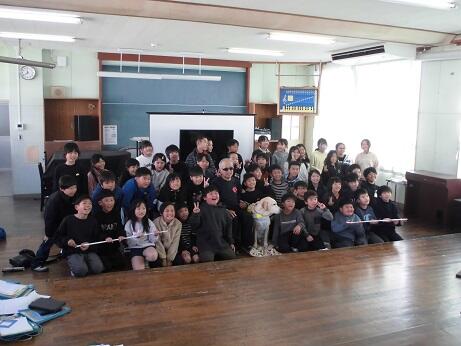 本日は、3年生が福祉学習で、盲導犬について学習しました。都城市社会福祉協議会の方がコーディネートしてくださり、実際に盲導犬とユーザーの方を講師にお招きすることができました。