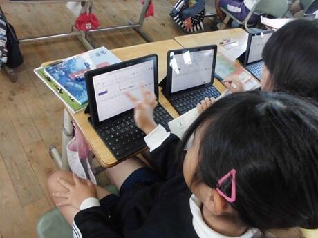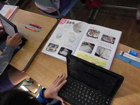 子どもたちは、図鑑を見ながら、食品の加工について、調べてタブレットでまとめていました。