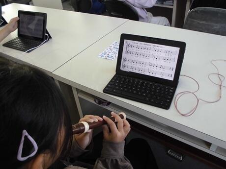 デジタル楽譜です。よくテレビの「街角ピアノ」を弾いている場面で見かけるのですが、デジタルの楽譜を普通に使います。もちろん紙を選ぶ子どももいて、教師はそのリクエストにも応えますが、基本はデジタルです。