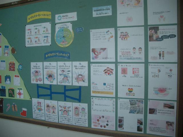 保健室の前には、「かぜをひかない工夫」や「大切な命」に関する掲示物がありました。
