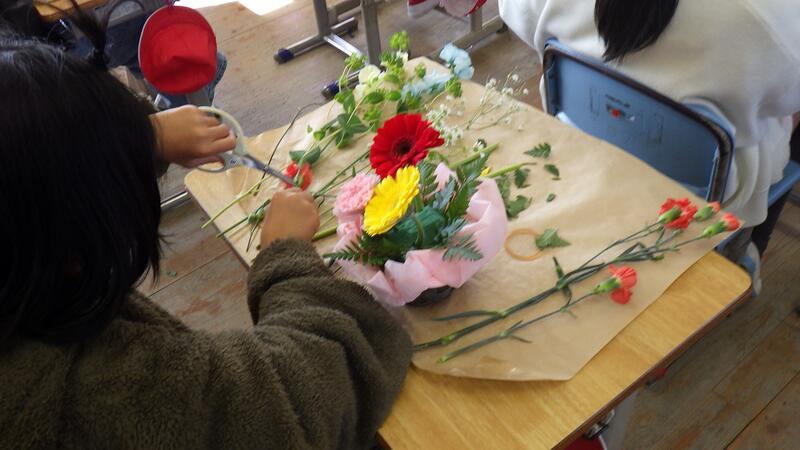 フラワーアレンジの資格をもつ技能士の方々にプロの指導をしていただける絶好の機会となりました。一人一人の子ども達が丁寧な指導を受け、ガーベラ、カーネーション、スイートピー等の花を切りながら、きれいに飾り付けていきました。
