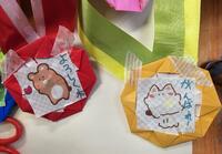 はい、出来上がった作品と一緒にピース!(^^)! 和紙できれいな傘の飾り物が完成しましたー!