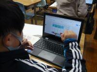 3年生は、算数の時間に「はかるものの重さに合うはかりを選んでおもさをはかる」学習に取り組んでいました。まず、手でもってみてどのくらいの重さか予想を立てます。担任からは、『chromebook(クロームブック)の重さが約1kgだから、それより重いか軽いかで予想が立てられそうだね。』という助言がありました。日頃から活用しているchromebookを使って、実感としての重さにも役立てることができました。