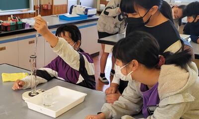 慎重にスポイドを使って水の量をはかりとり、メスシリンダーに注ぎ込みます。