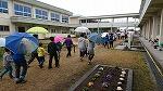 残念ながら雨が降った中での訪問でしたが、5年生が園児と手をつなぎながら