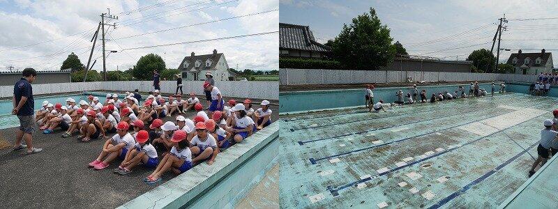 1・2年生は2時間目に行いました。1年生は初めての、2年生は1年ぶりのプールにワクワクしながら、活動していました。