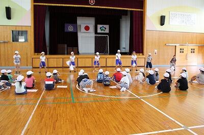 「体をしっかり曲げて!」低学年の児童も準備運動ができてますね。