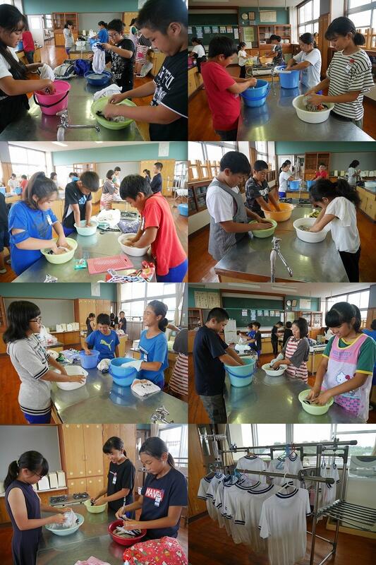 体操服をつけこみ、押し洗い、つまみ洗い、もみ洗い、部位にあった洗い方を実践していきました。