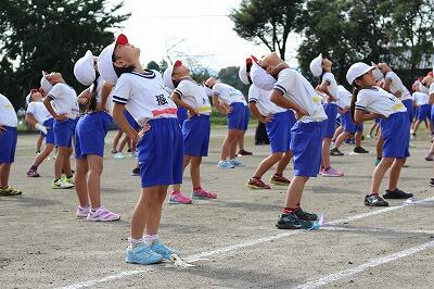 「体をしっかり曲げて!」低学年の児童も準備運動ができてますね。