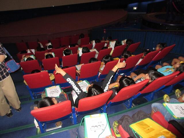 最初の目的地である宮崎科学技術館では、ほぼ貸し切り状態で見学することができました。まずプラネタリウムを見ました。当日の宮崎市内の夜空を見ながら星の説明や、星座になった話をしてもらい、子どもたちは集中して星を見ていました。