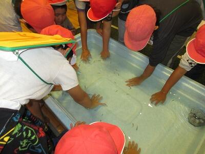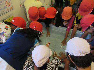 大淀川学習館ではまず、ガラ・ルファフィッシュ(ドクターフィッシュ)の体験をしました。小さい魚に手をつつかれ、くすぐったがりながらも楽しそうにしていました。体験の後は手がツルツルになったと喜んでいました。