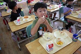 7月21日、今日の給食は子どもたちの好きな献立のひとつである、ジャージャー麺とフルーツポンチでした。1年生はにこにこしながら食べていました。