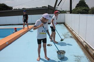 7月29日(水)、今日は6年生がプール掃除を頑張ってくれました。最初、新しいプールの感触を軽く確かめた後、一生懸命に掃除を頑張っていました。