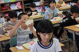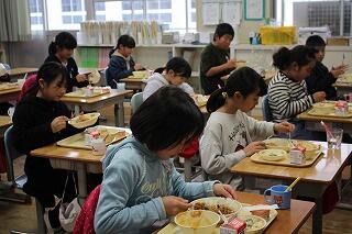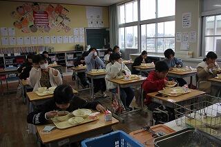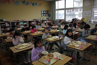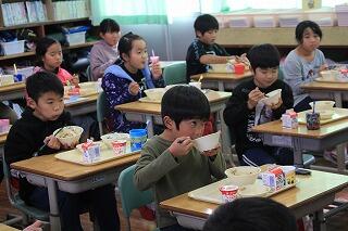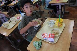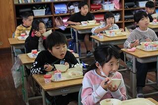 今日の給食は、石山小学校のリクエスト献立で、わかめご飯にマーボー豆腐、シュウマイ、デザートがヨーグルト、ということで、3年生の様子をのぞいてみました。担任の先生の話では、毎回モリモリ食べる学年だそうです。