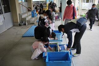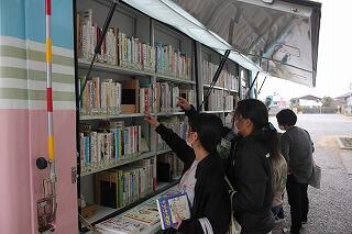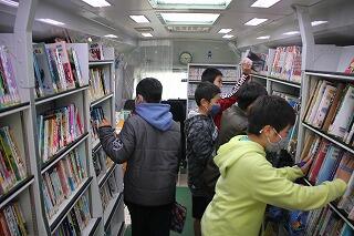 今日は、子どもたちが楽しみにしている移動図書館のクレヨン号の来校日です。借りることができる本の数は限られているので、真剣なまなざしで本を選んでいました。