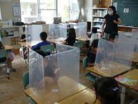 感染症予防対策として、対面での学習では「パーテーション」を活用しています。1年生は算数の学習、6年生は国語の学習で活用している様子です。