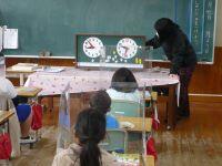 今日1年生は、算数の学習がありました。時計の模型を見ながら、何時何分なのか、みんなで確かめる学習に取り組んでいました。時計の数字が書いてあるところは、5分・10分・15分・20分・25分というように時間が進むことも確かめていました。