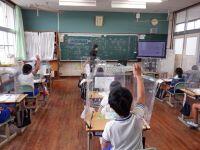 今日3年生は、外国語活動がありました。色と形を組み合わせて、英語で答える活動をしていました。モニターに色のついた様々な形が映し出され、その形の呼び方を英語で練習します。その後、モニターからいくつかの形が消えていきます。画面から消えた形を思い出して答える活動です。覚えている形を夢中になって発表する3年生の姿がありました。外国語活動に意欲的に取り組んでいます。