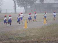 今日3年生は、体育の学習で持久走をしていました。トラックの内周1周の後、外周を2周、最後に内周を1周してゴールです。約800mを走ります。自分のペースで走ることを基本に、それぞれの目標記録に向けて取り組んでいます。