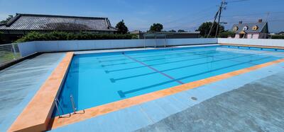 授業の合間の、誰もいないプールの水も輝いています。気持ちよさそう。
